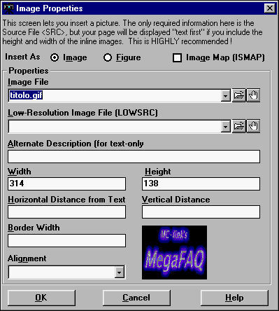 Fig.6 - Image PropertiesTramite questa finestra è possibile controllare tutti i parametri di inserimento delle immagini nel documento in costruzione. La dichiarazione delle dimensioni lineari dell'immagine consente al browser che visualizzerà il vostro documento di caricare l'intera pagina in un tempo ridotto, senza la necessità di attendere l'arrivo di tutta la grafica. Il web-editing è anche una questione di eleganza! Oltre ai normali dati del file grafico, è possibile stabilire un'immagine a bassa risoluzione che il browser caricherà in pochi istanti prima della corrispondente immagine a risoluzione piena; questo è uno stratagemma utilizzato da alcuni disegnatori di documenti ipertestuali per permettere agli utenti di verificare rapidamente il contenuto delle pagine senza la necessità di attendere il caricamento della grafica, soprattutto sui siti soggetti ad elevati volumi di traffico, quindi forzatamente più lenti. Gli altri parametri riguardano il tag ALT, che consente di inserire un testo esplicativo destinato ad essere visualizzato al posto di un'immagine nei borwser solo testo, tipo il noto Lynx: il Web è frequentato anche da persone che non possono usufruire della grafica!